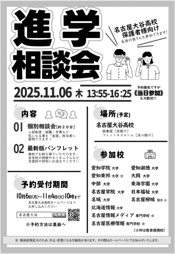 本日の長距離走大会は、予定通り実施します。なお、各学年の集合時間は、2年生8時05分・1年生10時15分教室点呼です。その後国営木曽三川公園までバスで移動します。学年通信で指示された時間や注意事項を守って有意義な大会にしてください。皆さんの健闘を祈ります。